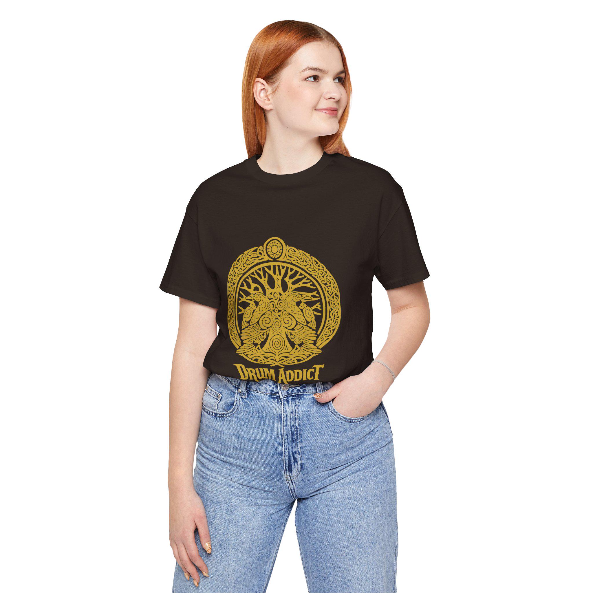 This lightweight cotton tee carries a warm, earthy vibe for drummers and rhythm-lovers. A single-color golden illustration—an ornate tree of life woven with drum motifs—sits center chest above the bold “Drum Addict” wordmark. The breathable Airlume combed cotton feels soft against the skin and layers easily under a jacket or over a practice shirt. Subtle construction details—side seams for shape retention, ribbed knit collar, shoulder tape, and a tear-away label—keep the fit clean and comfortable for long rehearsals, jam nights, or casual outings. Ethically manufactured and REACH certified, the tee blends music-minded style with responsible production.
