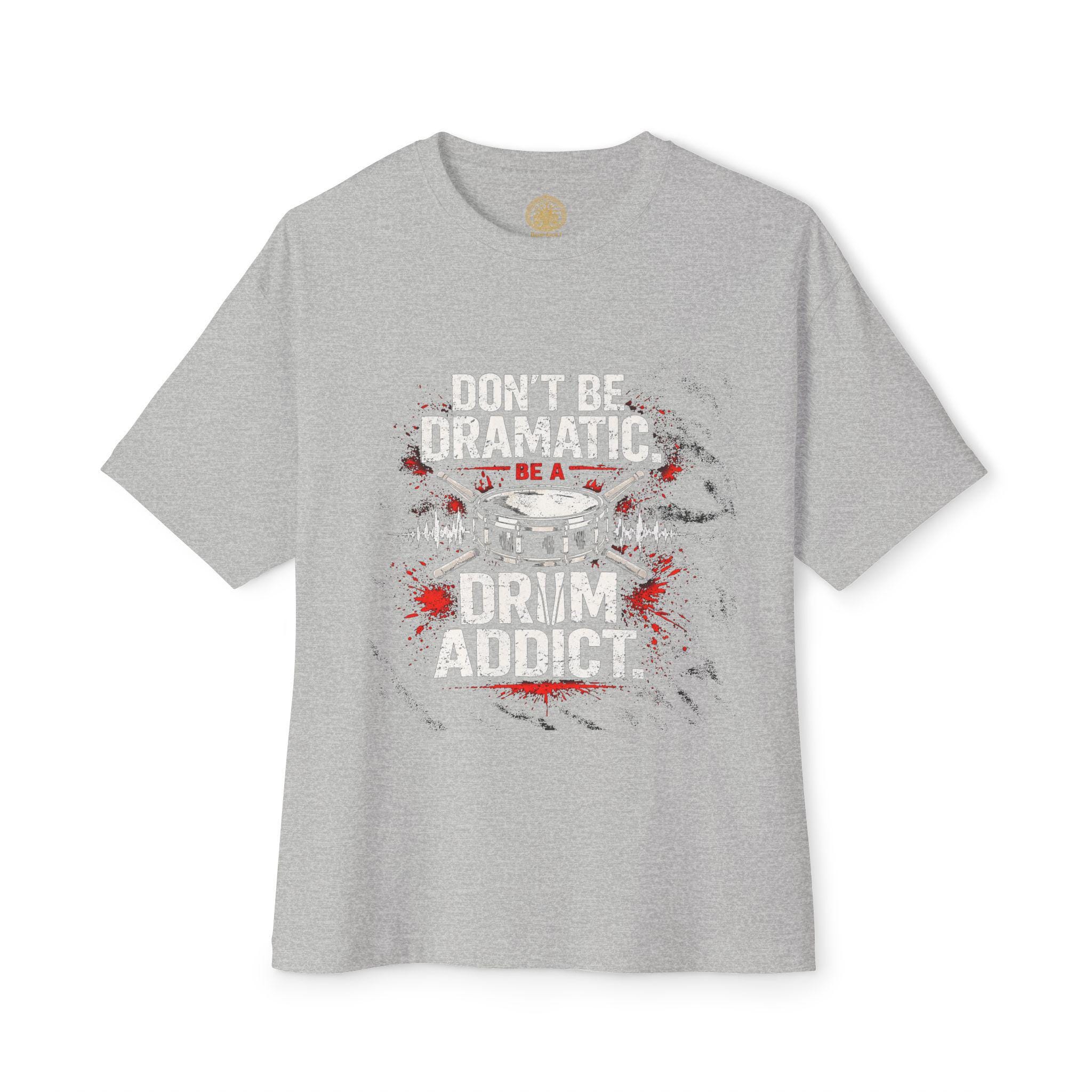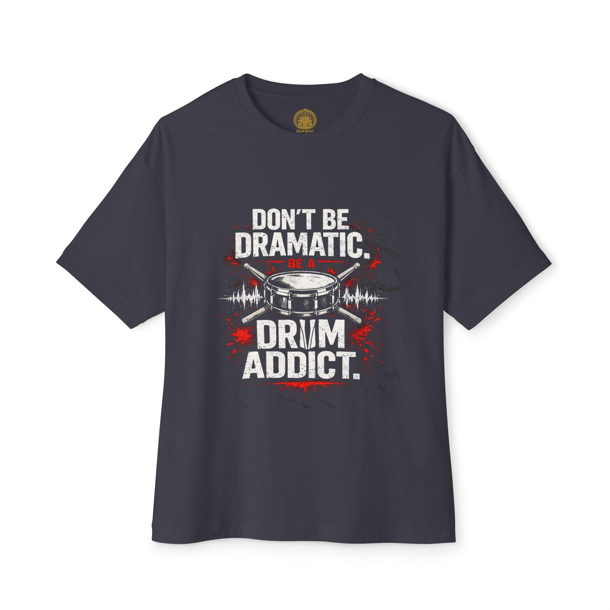 This oversized boxy tee channels the steady, relentless pulse of a practiced drummer. It hangs loose over the shoulders, giving room to breathe and move during long rehearsals or impromptu jam sessions. Wear it to practice, to the studio, or on nights when you need to feel grounded to the beat. The muted, no-nonsense message — “Don’t be dramatic. Be a drum addict.” — sits like an inside nod to anyone who lives for rhythm. Soft, substantial cotton and a relaxed silhouette make it comfortable for standing behind a kit, lugging a snare between venues, or lounging after a late set. It settles into the everyday of people who count in fours, talk tempo, and appreciate gear that quietly endures.